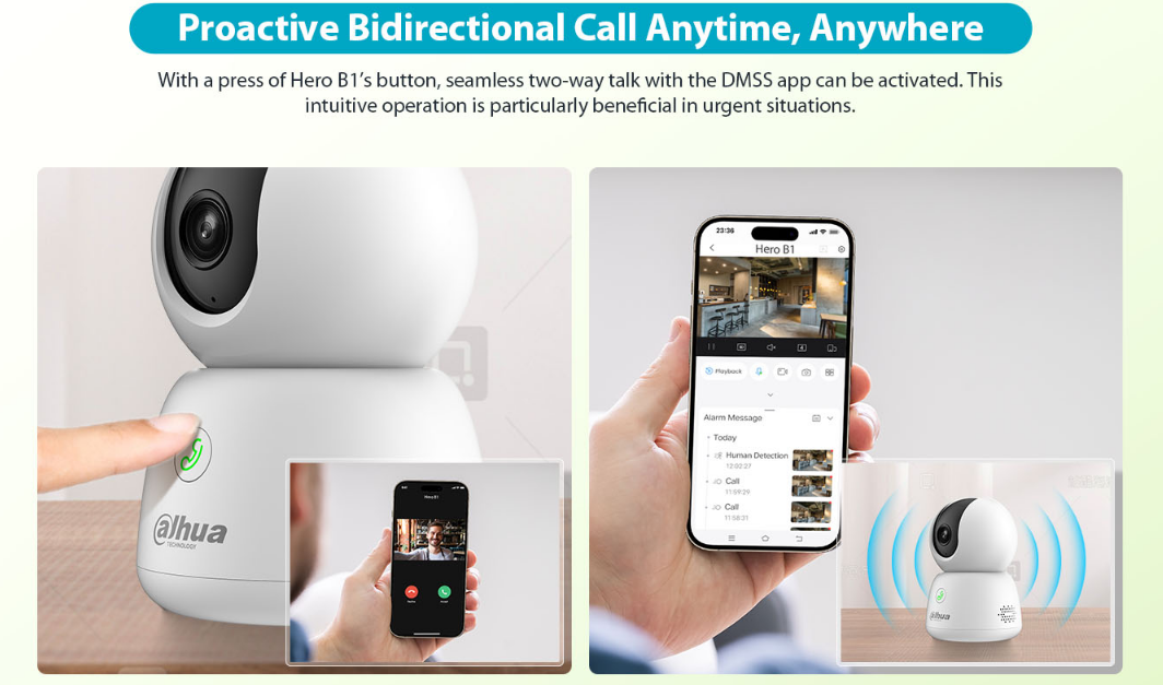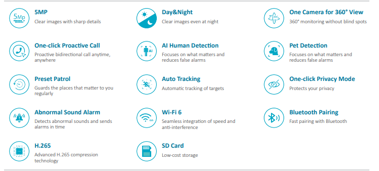Dahua Wireless series cameras are not only easy to install and operate, but also perform outstandingly and cost-effective. They provide full coverage of a scene with 5MP resolution, 0° to 350° pan and -5°to 80° tilt. Their powerful functions, such as one-click proactive call, preset petrol, AI human detection & pet detection, and auto tracking, assist with the accurate detection and continuous tracking of targets. Information is also synchronously sent to your phone to keep you up to date.